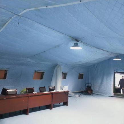 1月(yuè)29日(rì),新疆京和(hé)公司接到(dào)任務,和(hé)田市(shì)政府在火(huǒ)車(chē)站(zhàn)成立防控指揮部,急需指揮帳篷。公司立即響應,緊急協調,副總經理(lǐ)先海(hǎi)洋帶領值守人(rén)員(yuán)從(cóng)庫房(fáng)調出帳篷、氣泵、照(zhào)明(míng)燈、熱(rè)風(fēng)機(jī),同時(shí)跟當地(dì)派出所聯系了(le)10名警力,僅用(yòng)2個(gè)小(xiǎo)時(shí),一(yī)個(gè)150平方米充氣帳篷指揮部投入使用(yòng),得(de)到(dào)了(le)和(hé)田市(shì)人(rén)民(mín)政府的(de)高(gāo)度評價。